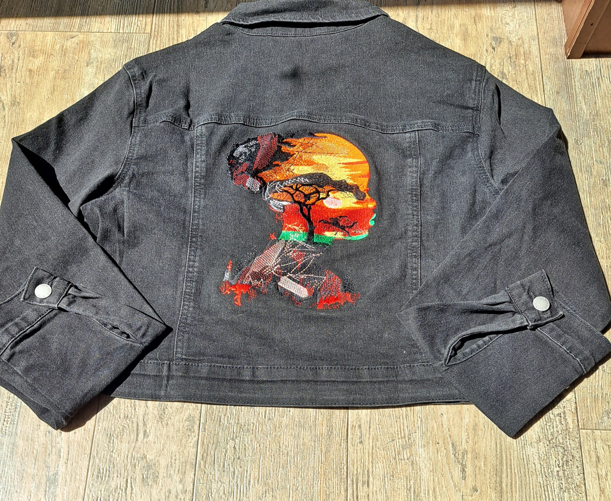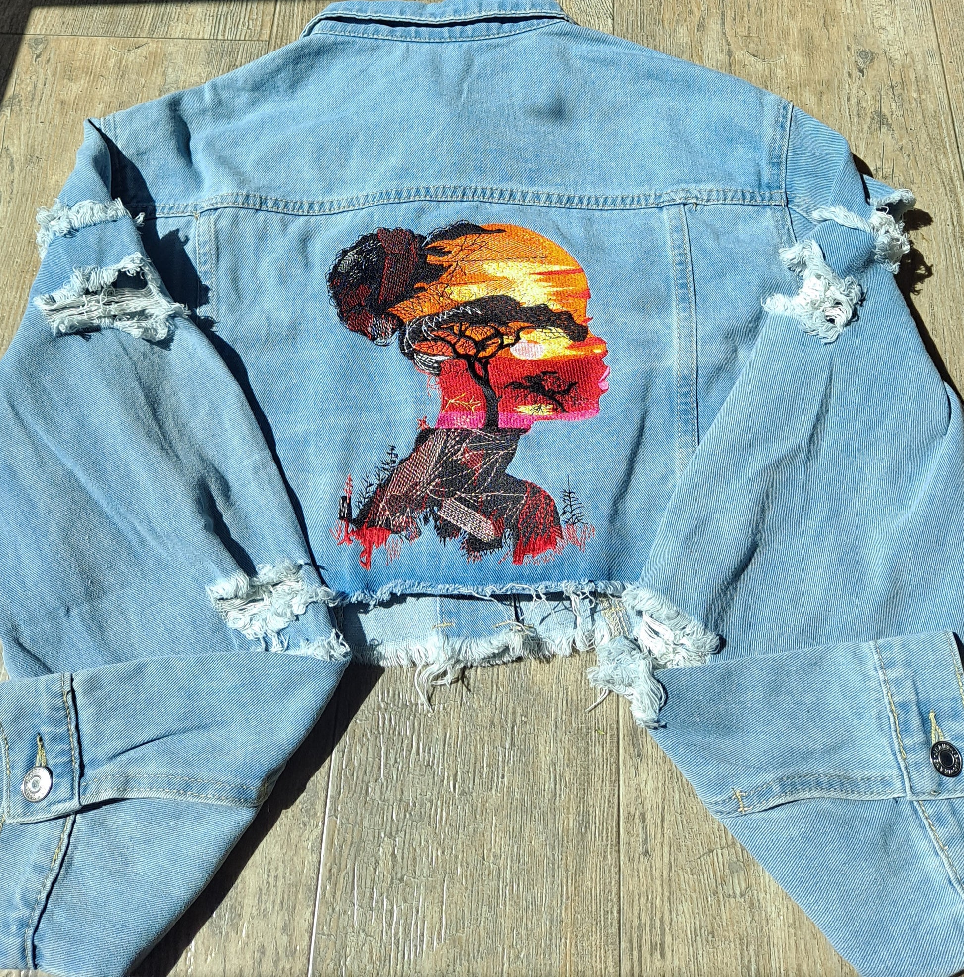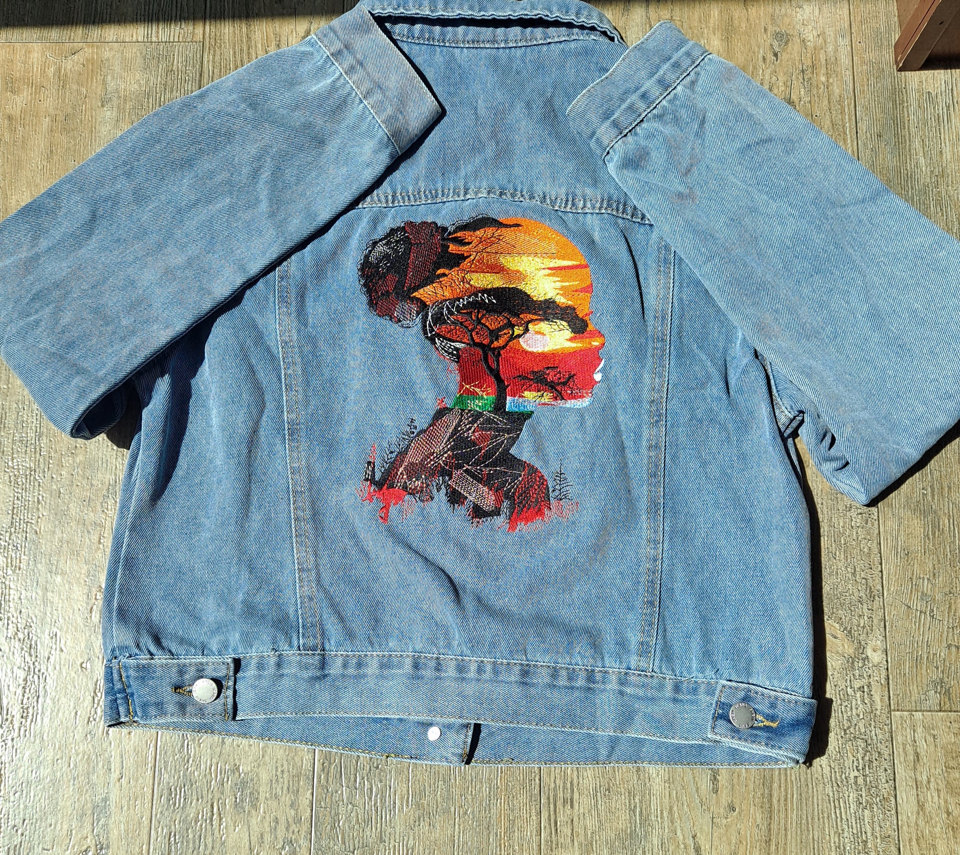 Introducing Natural Woman, the ultimate personalized jean jacket featuring a beautifully embroidered design of a woman with a sunset background. Elevate your style with this unique and eye-catching piece, perfect for expressing your individuality. Crafted with precision and care, this jacket is a must-have for any fashion-forward woman.